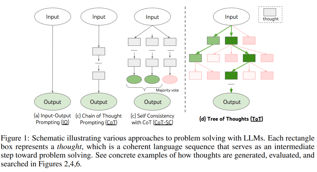 Further research has expanded on the CoT concept. More sophisticated strategies include self-consistency, which generates multiple CoT responses and selects the best one (paper here), and the Tree of Thoughts approach, which accommodates non-linear thinking, as explored in several papers (see 1 & 2). These advancements underscore the evolving complexity and great potential of prompt engineering.