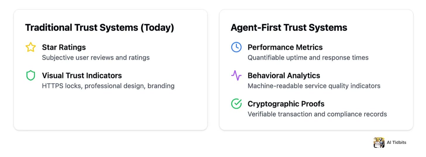 Perhaps no aspect of online commerce requires more fundamental reimagining than trust and reputation systems. In an agent-mediated economy, traditional cues for reliability fall short. AI agents can't interpret visual aesthetics or branding elements–they operate on data, protocols, and cryptographic proofs.