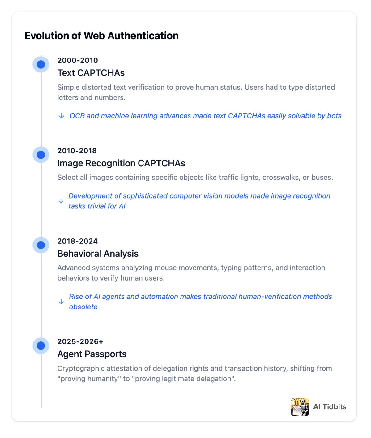 The challenge shifts from proving humanity to verifying the agent has been legitimately delegated and authorized by a human user.