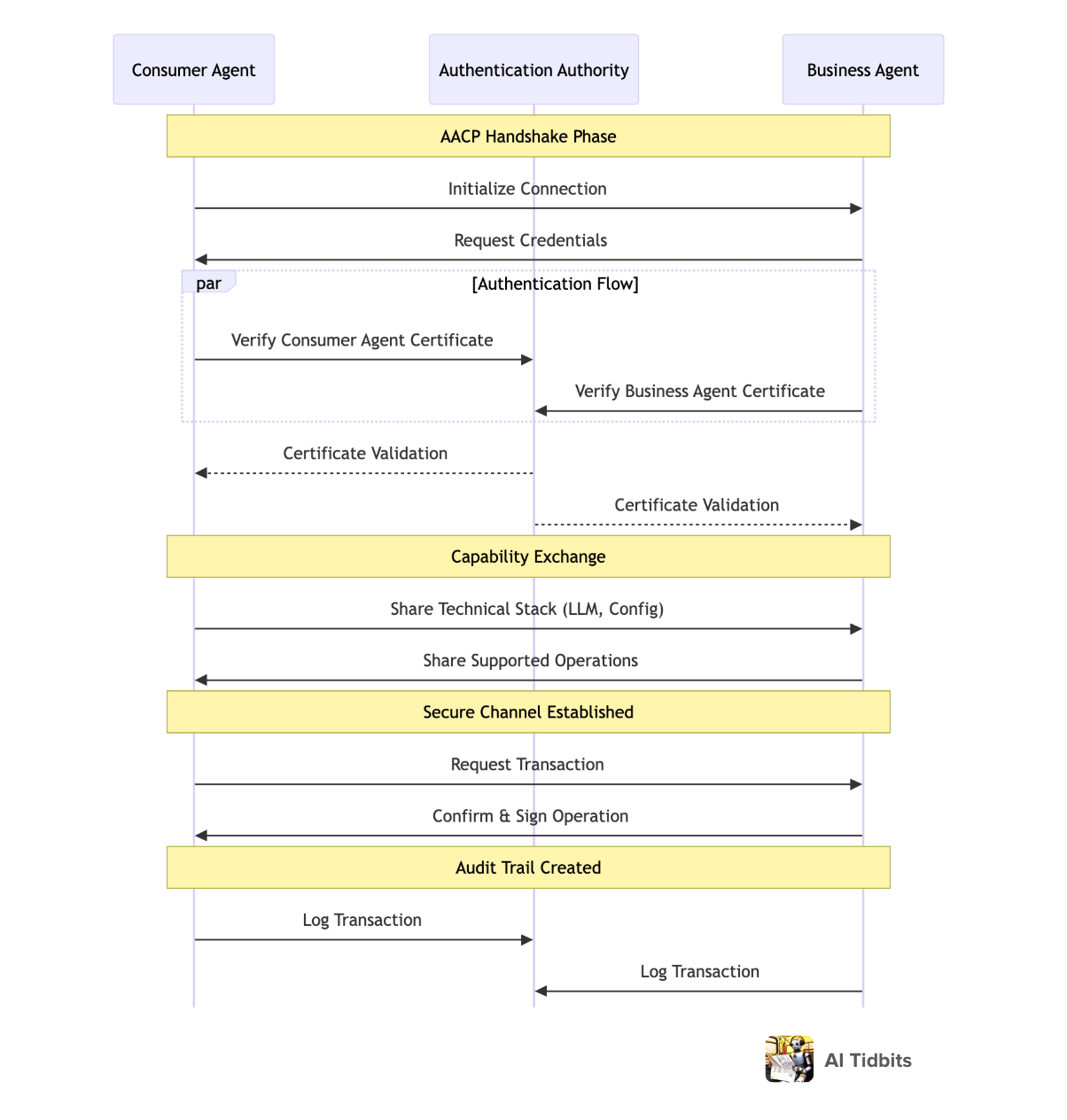 The handshake phase in AACP would include mutual disclosure of the agents’ technical stacks—such as which LLM or language configuration they use—and their supported capabilities. Once established, the protocol would also govern “write-like operations” (e.g., initiating a payment or updating account details) by enforcing strict sign-offs with auditable cryptographic signatures. Every action would leave a verifiable trail of authorization that can be reviewed and validated after the fact.