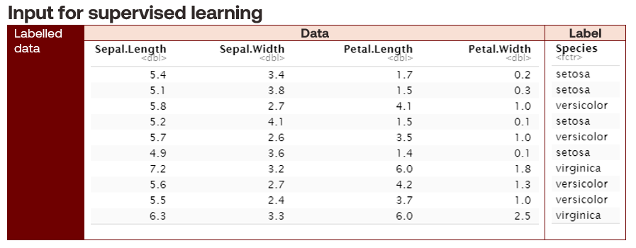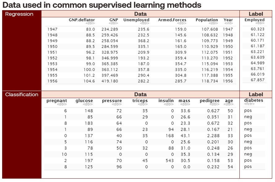 Supervised learning problems take labelled data as input to train algorithms to predict or classify outcomes. Labelled data describes training datasets containing a response variable. Some methods associated with supervised learning are regression and classification.