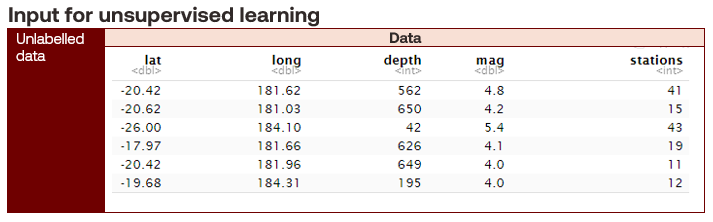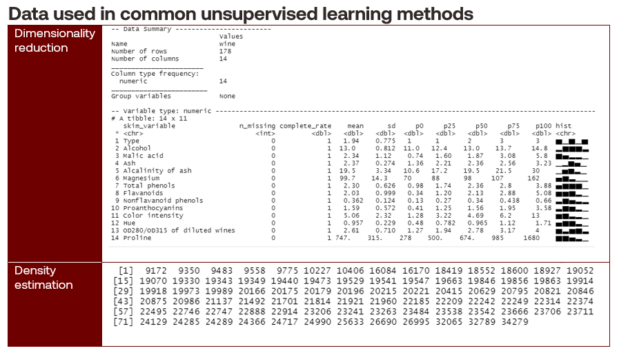 Unsupervised learning problems take unlabelled data as input and discover patterns within them. Unlabelled data describes training data sets that do not contain a response variable. Common methods include dimensionality reduction and density estimation.