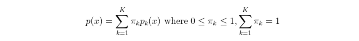 Density estimation techniques are concerned with estimating the probability distributions of unlabelled data, such as finding galaxy clusters. An example of density estimation is Gaussian mixture models (GMM) that express a single distribution as a combination of K Gaussian distributions, as follows: