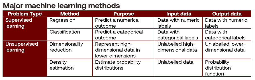 Machine learning refers to the collection of step-by-step processes called algorithms to solve a problem. Supervised learning problems predict outcomes from labelled data, whereas unsupervised learning problems discover patterns and relationships in unlabelled data. Reinforcement learning problems involve an intelligent agent learning from its environment.