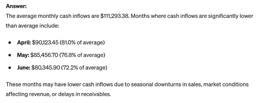 When we asked GPT-4o about the monthly cash flow, it provided a list showing the cash balance and liquidity position for each month.