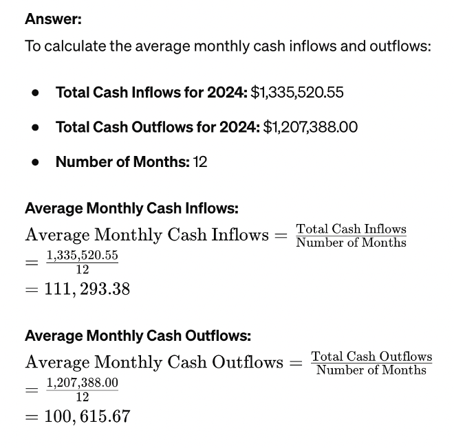 Q. Calculate the average monthly cash inflows and outflows for 2024.