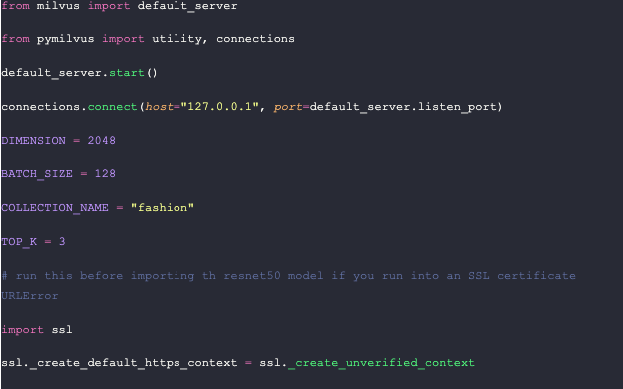 We also use this section to set up some constants. Let’s define the number of dimensions in a vector (from the Nvidia ResNet50 model), the batch size, the name of our collection, and the number of results to return. Finally, we run an `ssl` function to create an unverified context to get the model from PyTorch.