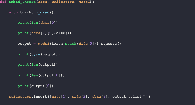Similar to the `embed_insert` function, I added several print statements here to keep track of the data. As shown below, the `data` passed into this function is essentially the `data[0]` object, in comparison to the `embed_insert` function.