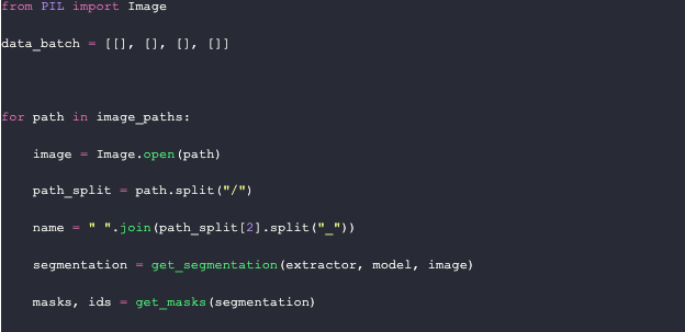 Remember that extractor and segmentation model we talked about earlier? This is where we use them. We use this pre-trained segformer model from Hugging Face. After loading the models, we put all the file paths into a list to loop through.