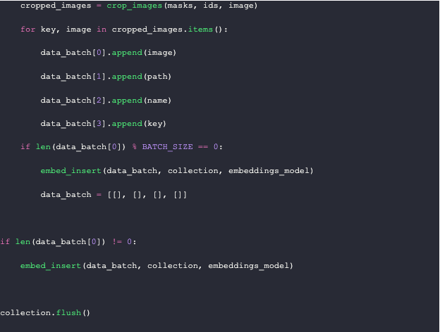 Every 128 images, we embed and insert them into Milvus, and then clear out the data batch. At the end of the loop, we embed and insert the rest of the data batch into Milvus and flush it to complete the indexing. On an M1 2021 Mac with 16GB of RAM, this process takes approximately 8 minutes to run.