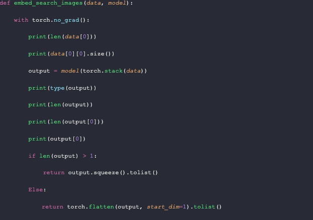 Similar to how we load images into the database, we need to process input images. The function for embedding search images takes two parameters: data and the (embedding) model. We use the model to get the embeddings, flatten or squeeze them depending on the number of images queried, convert them into a list, and return them.
