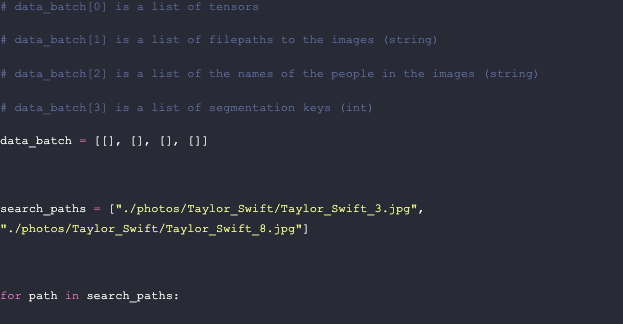 In addition to printing debugging data, we stack all the values in `data[0]` into one tensor and then remove any dimensions of size 1 from the output using the `squeeze` function. Then, we insert a new list consisting of the last three entries of the original data batch, followed by the output tensor converted into a list. These correspond to the file path, name, segmentation ID, and the 2048 dimensional embedding.