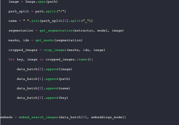 Milvus expects a list of lists as input. In this example, we use a list of 4 lists, which correspond to the image, the file path, the name, and the segmentation ID. In the `embed_insert` function, we convert the image into a vector embedding. We then loop through each file path to the images, gather their segmentation masks, and crop them. Finally, we add the images with their metadata to the data batch.