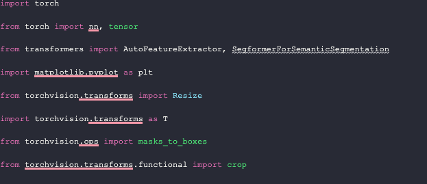 We begin by importing the necessary packages for image manipulation in this project. These include `torch` for feature extraction, `segformer` object from `transformers`, `matplotlib`, and some `torchvision` imports such as `Resize, masks_to_boxes`, and `crop`.