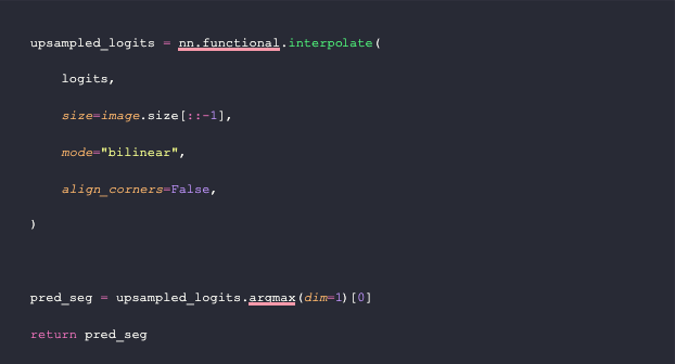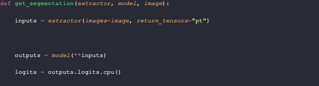 The `get_segmentation` function requires three parameters: a feature extractor, a model, and an image. First, it generates input features using the image and extractor. Then, it obtains the model output and converts it into logits. Afterward, it upsamples the logits through a PyTorch bilinear interpolation. Finally, the function takes only the maximum prediction for each pixel in the upsampled samples to create a segmentation mask.